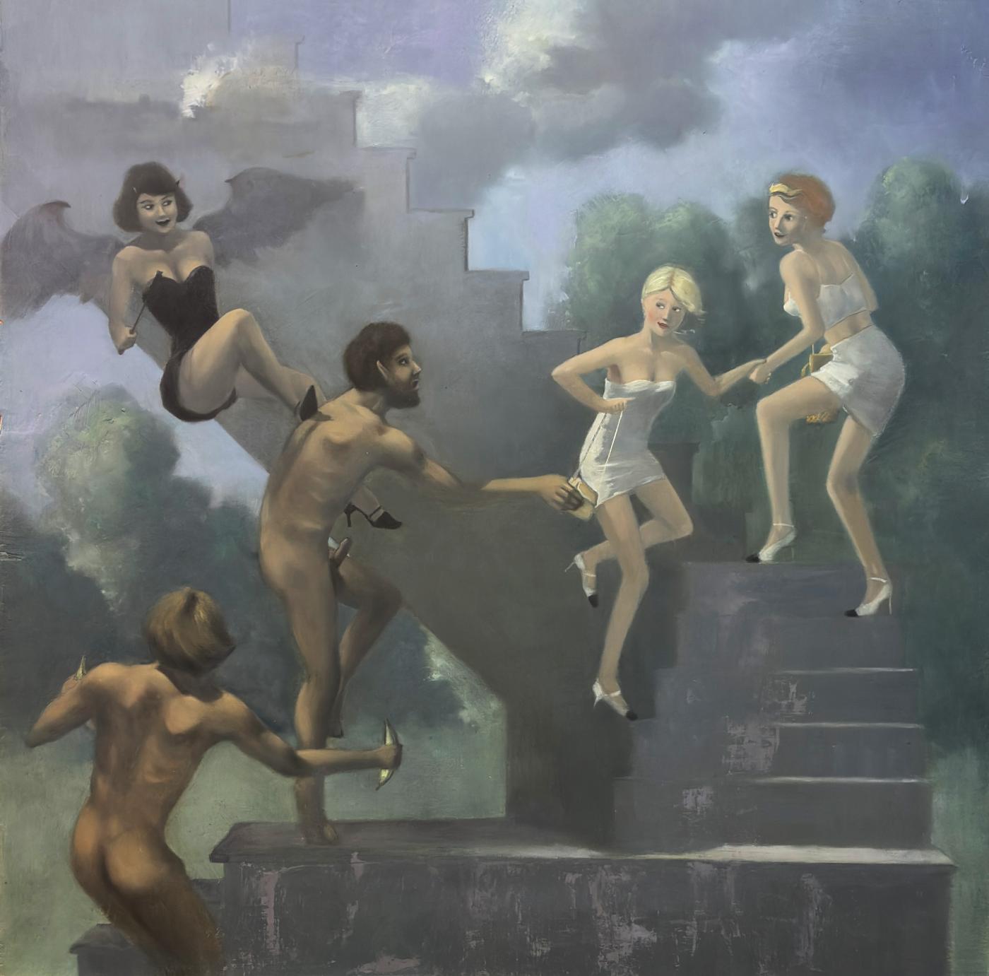 Artist Comment: In the second half of 2025 I began to allow "shadow" images into my paintings, whereas previously they were banned. It turns out that paintings with no dark in them are less interesting on multiple levels. The "shadow" is a Jungian term, referring generally to the dark or shadow side of all of us in a very dualistic realm of Earth. Here we also see Virgin, Mother (symbolized by the basket she holds), and Crone symbolism. The virgin is a passive victim here, the mother a nurturer, and the crone has learned to master and dominate men. Here the crone is depicted as a shadow figure that is actually helpful, a teacher, an "ally".