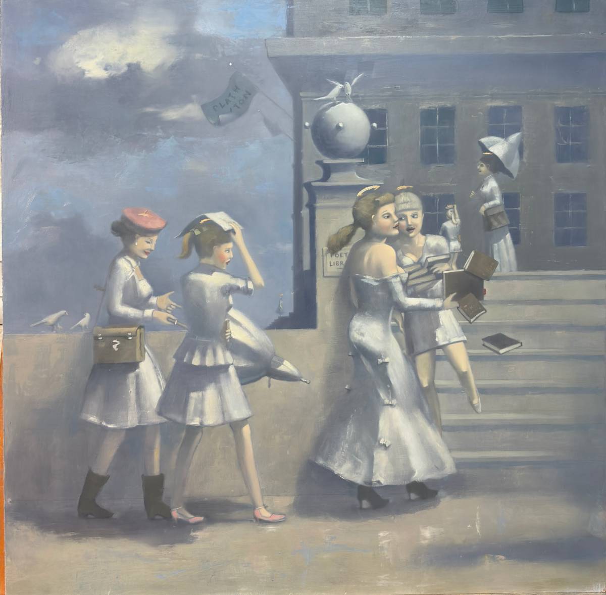 Artist Comment: I was again trying to paint fashionable angels, in a relatively dynamic composition, with a brooding mood and subdued colors. I added symbolism with the doves. This painting is not varnished or entirely finished (the doves are still fairly rough), but I photographed it anyway in November 2025, along with the rest of the class of 2025.