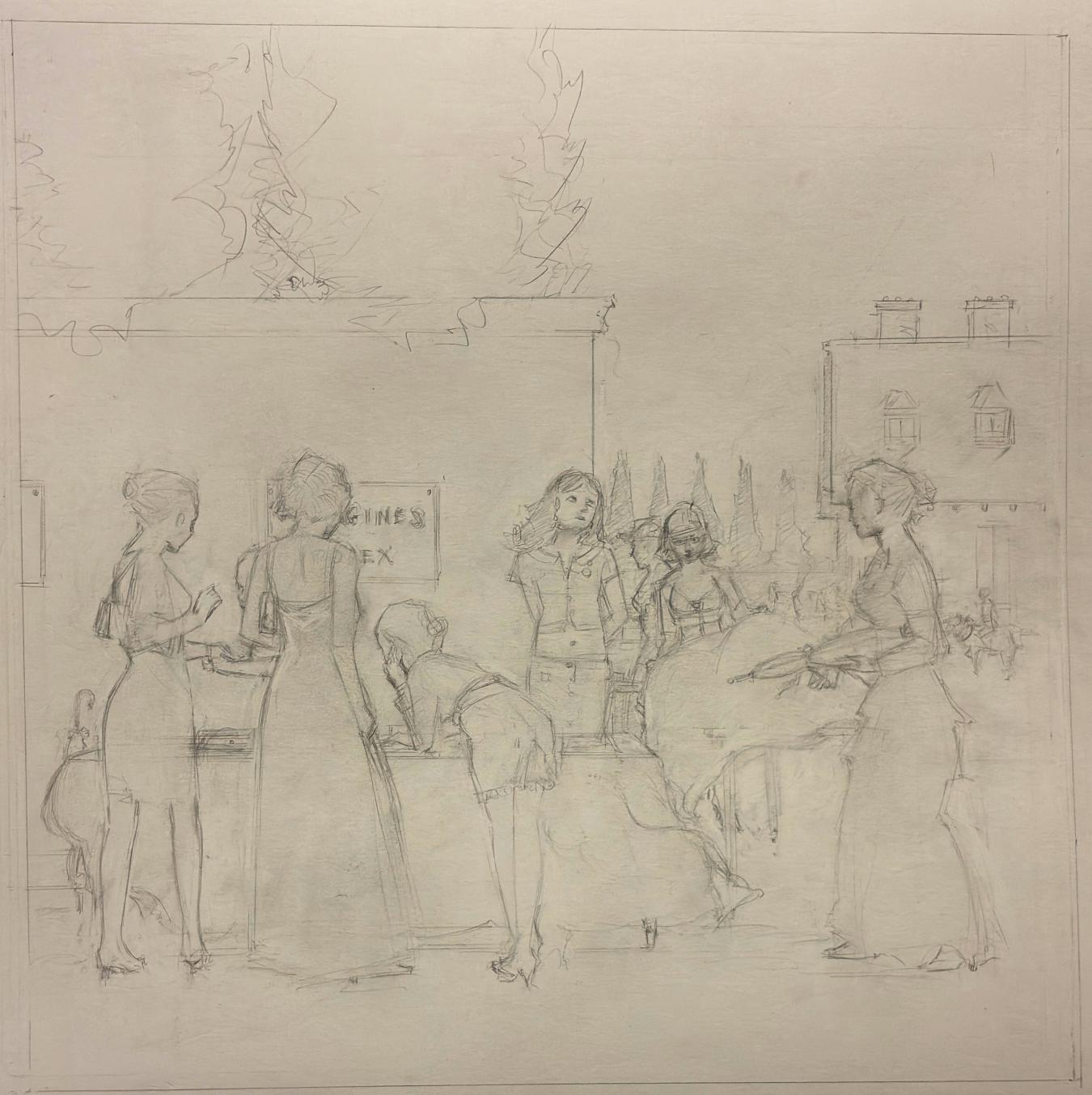 Artist Comment: This is one of two compositions at the start of 2026. They are much more free form and crowded with figures, obviously. I'm not sure yet how this will turn out in the oil painting phase. It will be an exercise in simplifying and washing everything with a moody tone. It's also just an exercise in figure and fabric painting. The more practice, the better.