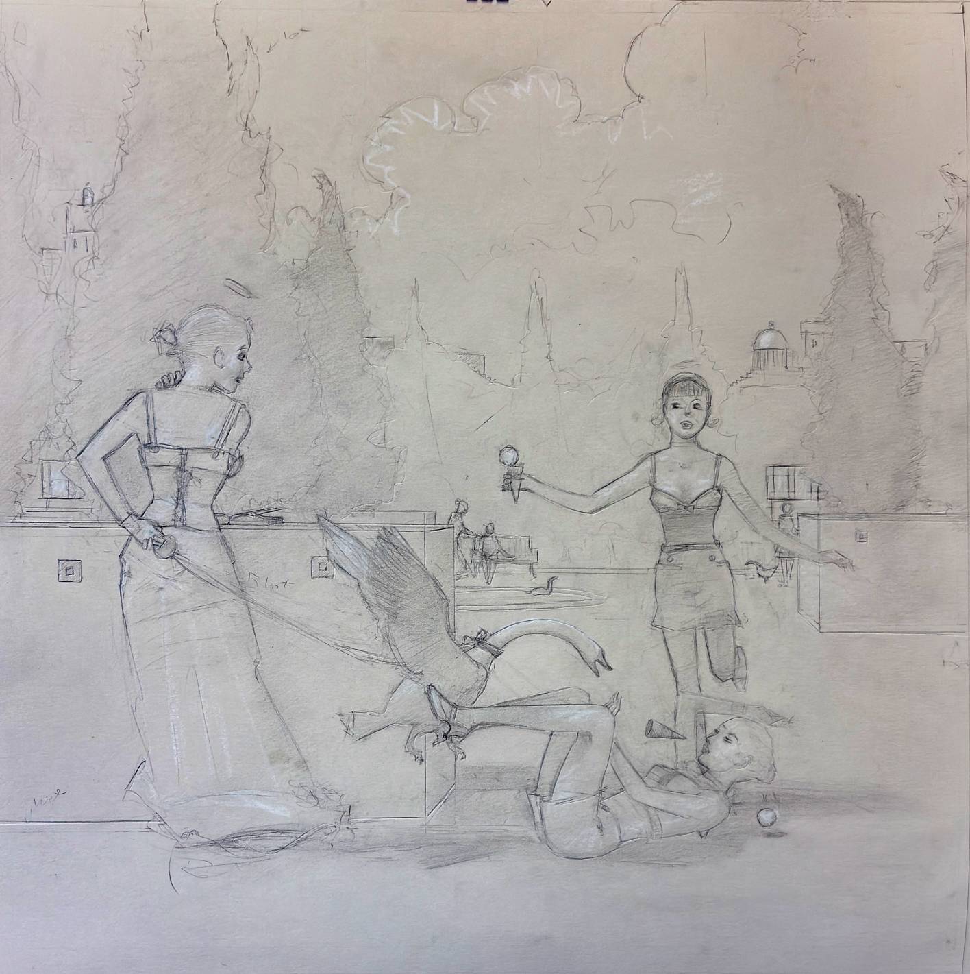 Artist Comment: This is a nice circular composition. This was my second use of cypress trees in the heavenly realm. So I was interested to introduce a lot of color and green into the work without going down to Earth. It's a nice composition with a lot of energy and movement, all rotating around the center ball of raspberry ice cream. The pink and green complementary colors are of course intentional at this phase, so I am looking at where the complements are positioned. This is another drawing, however, that is arguably fresher and better than the final painting.